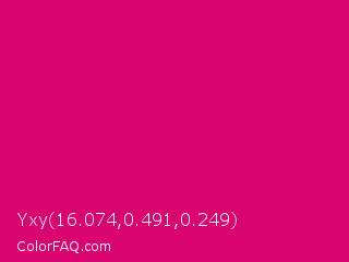 Yxy 16.074,0.491,0.249 Color is a normal rose color and the nearest color is Red Purple #e40078. Hex code #d90470 and RGB value is rgb(217,4,112). In RGB color space, this color is composed of 85% red, 2% green, 44% blue, In CMYK color space, this color is composed of 0% cyan, 98% magenta, 48% yellow , 15% black , In HSL color space, this color has a hue angle of 330° , 96% saturation and 43% lightness.