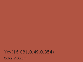 Yxy 16.081,0.49,0.354 Color is a normal red color and the nearest color is Brown Rust #af593e. Hex code #b15442 and RGB value is rgb(177,84,66). In RGB color space, this color is composed of 69% red, 33% green, 26% blue, In CMYK color space, this color is composed of 0% cyan, 53% magenta, 63% yellow , 31% black , In HSL color space, this color has a hue angle of 10° , 46% saturation and 48% lightness.