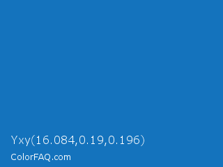 Yxy 16.084,0.19,0.196 Color is a normal blue color and the nearest color is Green Blue #1164b4. Hex code #1473bd and RGB value is rgb(20,115,189). In RGB color space, this color is composed of 8% red, 45% green, 74% blue, In CMYK color space, this color is composed of 89% cyan, 39% magenta, 0% yellow , 26% black , In HSL color space, this color has a hue angle of 206° , 81% saturation and 41% lightness.