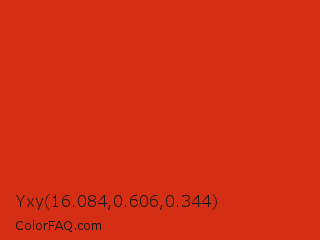 Yxy 16.084,0.606,0.344 Color is a normal red color and the nearest color is Vermilion #d9381e. Hex code #d42f15 and RGB value is rgb(212,47,21). In RGB color space, this color is composed of 83% red, 18% green, 8% blue, In CMYK color space, this color is composed of 0% cyan, 78% magenta, 90% yellow , 17% black , In HSL color space, this color has a hue angle of 8° , 82% saturation and 46% lightness.