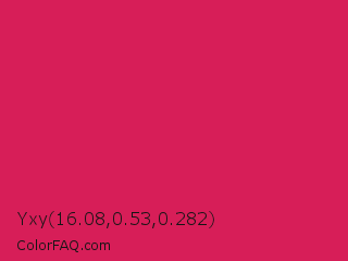 Yxy 16.08,0.53,0.282 Color is a normal rose color and the nearest color is Dogwood Rose #d71868. Hex code #d71e58 and RGB value is rgb(215,30,88). In RGB color space, this color is composed of 84% red, 12% green, 35% blue, In CMYK color space, this color is composed of 0% cyan, 86% magenta, 59% yellow , 16% black , In HSL color space, this color has a hue angle of 341° , 76% saturation and 48% lightness.