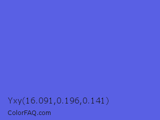 Yxy 16.091,0.196,0.141 Color is a light blue color and the nearest color is Majorelle Blue #6050dc. Hex code #5960e4 and RGB value is rgb(89,96,228). In RGB color space, this color is composed of 35% red, 38% green, 89% blue, In CMYK color space, this color is composed of 61% cyan, 58% magenta, 0% yellow , 11% black , In HSL color space, this color has a hue angle of 237° , 72% saturation and 62% lightness.