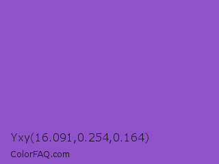 Yxy 16.091,0.254,0.164 Color is a normal purple color and the nearest color is Deep Lilac #9955bb. Hex code #8f52c9 and RGB value is rgb(143,82,201). In RGB color space, this color is composed of 56% red, 32% green, 79% blue, In CMYK color space, this color is composed of 29% cyan, 59% magenta, 0% yellow , 21% black , In HSL color space, this color has a hue angle of 271° , 52% saturation and 55% lightness.