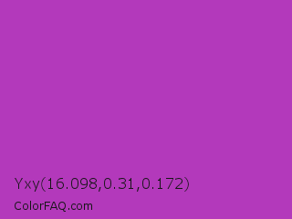 Yxy 16.098,0.31,0.172 Color is a normal magenta color and the nearest color is Byzantine #bd33a4. Hex code #b339bb and RGB value is rgb(179,57,187). In RGB color space, this color is composed of 70% red, 22% green, 73% blue, In CMYK color space, this color is composed of 4% cyan, 70% magenta, 0% yellow , 27% black , In HSL color space, this color has a hue angle of 296° , 53% saturation and 48% lightness.