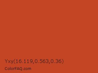 Yxy 16.119,0.563,0.36 Color is a normal red color and the nearest color is Dark Pastel Red #c23b22. Hex code #c44524 and RGB value is rgb(196,69,36). In RGB color space, this color is composed of 77% red, 27% green, 14% blue, In CMYK color space, this color is composed of 0% cyan, 65% magenta, 82% yellow , 23% black , In HSL color space, this color has a hue angle of 12° , 69% saturation and 45% lightness.