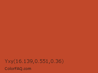 Yxy 16.139,0.551,0.36 Color is a normal red color and the nearest color is Mojo #c04737. Hex code #c1482a and RGB value is rgb(193,72,42). In RGB color space, this color is composed of 76% red, 28% green, 16% blue, In CMYK color space, this color is composed of 0% cyan, 63% magenta, 78% yellow , 24% black , In HSL color space, this color has a hue angle of 12° , 64% saturation and 46% lightness.