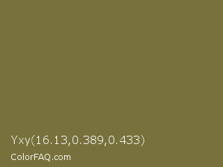 Yxy 16.13,0.389,0.433 Color is a normal yellow color and the nearest color is Pesto #7c7631. Hex code #78713c and RGB value is rgb(120,113,60). In RGB color space, this color is composed of 47% red, 44% green, 24% blue, In CMYK color space, this color is composed of 0% cyan, 6% magenta, 50% yellow , 53% black , In HSL color space, this color has a hue angle of 53° , 33% saturation and 35% lightness.