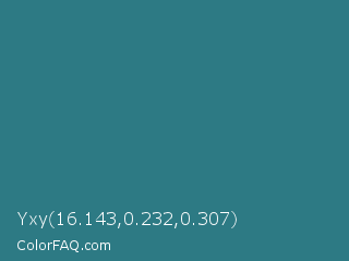Yxy 16.143,0.232,0.307 Color is a normal cyan color and the nearest color is Paradiso #317d82. Hex code #2d7a84 and RGB value is rgb(45,122,132). In RGB color space, this color is composed of 18% red, 48% green, 52% blue, In CMYK color space, this color is composed of 66% cyan, 8% magenta, 0% yellow , 48% black , In HSL color space, this color has a hue angle of 187° , 49% saturation and 35% lightness.