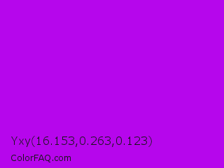 Yxy 16.153,0.263,0.123 Color is a normal purple color and the nearest color is Vivid Mulberry #b80ce3. Hex code #b606ec and RGB value is rgb(182,6,236). In RGB color space, this color is composed of 71% red, 2% green, 93% blue, In CMYK color space, this color is composed of 23% cyan, 97% magenta, 0% yellow , 7% black , In HSL color space, this color has a hue angle of 286° , 95% saturation and 47% lightness.