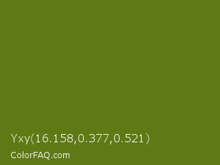 Yxy 16.158,0.377,0.521 Color is a dark lime color and the nearest color is Fern Frond #657220. Hex code #5f7914 and RGB value is rgb(95,121,20). In RGB color space, this color is composed of 37% red, 47% green, 8% blue, In CMYK color space, this color is composed of 21% cyan, 0% magenta, 83% yellow , 53% black , In HSL color space, this color has a hue angle of 75° , 72% saturation and 28% lightness.