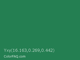 Yxy 16.163,0.269,0.442 Color is a normal green color and the nearest color is Eucalyptus #278a5b. Hex code #247f52 and RGB value is rgb(36,127,82). In RGB color space, this color is composed of 14% red, 50% green, 32% blue, In CMYK color space, this color is composed of 72% cyan, 0% magenta, 35% yellow , 50% black , In HSL color space, this color has a hue angle of 150° , 56% saturation and 32% lightness.
