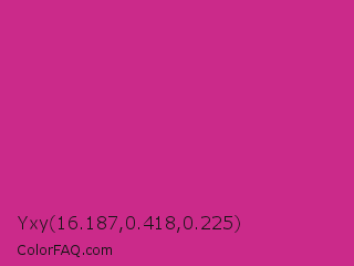 Yxy 16.187,0.418,0.225 Color is a normal magenta color and the nearest color is Royal Fuchsia #ca2c92. Hex code #cb2a8a and RGB value is rgb(203,42,138). In RGB color space, this color is composed of 80% red, 16% green, 54% blue, In CMYK color space, this color is composed of 0% cyan, 79% magenta, 32% yellow , 20% black , In HSL color space, this color has a hue angle of 324° , 66% saturation and 48% lightness.