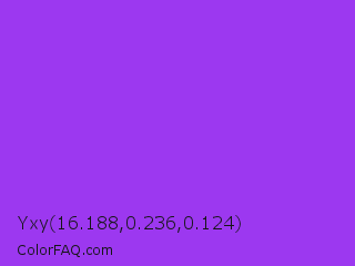 Yxy 16.188,0.236,0.124 Color is a normal purple color and the nearest color is Veronica #a020f0. Hex code #9c38f0 and RGB value is rgb(156,56,240). In RGB color space, this color is composed of 61% red, 22% green, 94% blue, In CMYK color space, this color is composed of 35% cyan, 77% magenta, 0% yellow , 6% black , In HSL color space, this color has a hue angle of 273° , 86% saturation and 58% lightness.