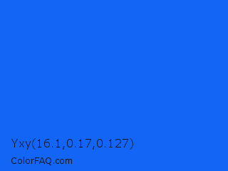Yxy 16.1,0.17,0.127 Color is a normal blue color and the nearest color is Blue Ribbon #0066ff. Hex code #1365f6 and RGB value is rgb(19,101,246). In RGB color space, this color is composed of 7% red, 40% green, 96% blue, In CMYK color space, this color is composed of 92% cyan, 59% magenta, 0% yellow , 4% black , In HSL color space, this color has a hue angle of 218° , 93% saturation and 52% lightness.