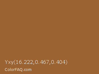 Yxy 16.222,0.467,0.404 Color is a normal orange color and the nearest color is Coconut #965a3e. Hex code #9c6332 and RGB value is rgb(156,99,50). In RGB color space, this color is composed of 61% red, 39% green, 20% blue, In CMYK color space, this color is composed of 0% cyan, 37% magenta, 68% yellow , 39% black , In HSL color space, this color has a hue angle of 28° , 51% saturation and 40% lightness.
