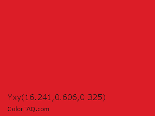 Yxy 16.241,0.606,0.325 Color is a normal red color and the nearest color is Maximum Red #d92121. Hex code #dc1d27 and RGB value is rgb(220,29,39). In RGB color space, this color is composed of 86% red, 11% green, 15% blue, In CMYK color space, this color is composed of 0% cyan, 87% magenta, 82% yellow , 14% black , In HSL color space, this color has a hue angle of 357° , 77% saturation and 49% lightness.