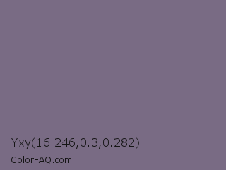 Yxy 16.246,0.3,0.282 Color is a normal purple color and the nearest color is Rum #796989. Hex code #796b84 and RGB value is rgb(121,107,132). In RGB color space, this color is composed of 47% red, 42% green, 52% blue, In CMYK color space, this color is composed of 8% cyan, 19% magenta, 0% yellow , 48% black , In HSL color space, this color has a hue angle of 274° , 10% saturation and 47% lightness.