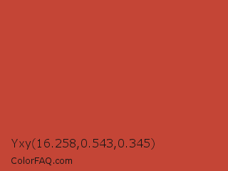 Yxy 16.258,0.543,0.345 Color is a normal red color and the nearest color is Mojo #c04737. Hex code #c44536 and RGB value is rgb(196,69,54). In RGB color space, this color is composed of 77% red, 27% green, 21% blue, In CMYK color space, this color is composed of 0% cyan, 65% magenta, 72% yellow , 23% black , In HSL color space, this color has a hue angle of 6° , 57% saturation and 49% lightness.