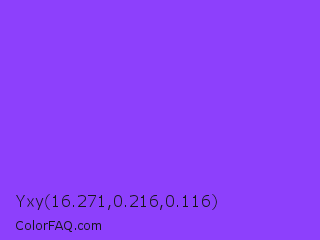 Yxy 16.271,0.216,0.116 Color is a light violet color and the nearest color is Navy Purple #9457eb. Hex code #8d40fc and RGB value is rgb(141,64,252). In RGB color space, this color is composed of 55% red, 25% green, 99% blue, In CMYK color space, this color is composed of 44% cyan, 75% magenta, 0% yellow , 1% black , In HSL color space, this color has a hue angle of 265° , 97% saturation and 62% lightness.