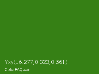 Yxy 16.277,0.323,0.561 Color is a dark green color and the nearest color is Bilbao #327c14. Hex code #368015 and RGB value is rgb(54,128,21). In RGB color space, this color is composed of 21% red, 50% green, 8% blue, In CMYK color space, this color is composed of 58% cyan, 0% magenta, 84% yellow , 50% black , In HSL color space, this color has a hue angle of 101° , 72% saturation and 29% lightness.
