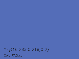Yxy 16.283,0.218,0.2 Color is a normal blue color and the nearest color is Indigo #4f69c6. Hex code #546db8 and RGB value is rgb(84,109,184). In RGB color space, this color is composed of 33% red, 43% green, 72% blue, In CMYK color space, this color is composed of 54% cyan, 41% magenta, 0% yellow , 28% black , In HSL color space, this color has a hue angle of 225° , 41% saturation and 53% lightness.