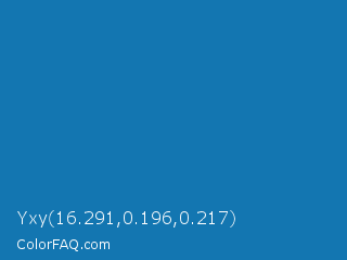 Yxy 16.291,0.196,0.217 Color is a normal blue color and the nearest color is Green Blue #1164b4. Hex code #1376b1 and RGB value is rgb(19,118,177). In RGB color space, this color is composed of 7% red, 46% green, 69% blue, In CMYK color space, this color is composed of 89% cyan, 33% magenta, 0% yellow , 31% black , In HSL color space, this color has a hue angle of 202° , 81% saturation and 38% lightness.
