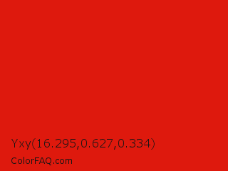 Yxy 16.295,0.627,0.334 Color is a normal red color and the nearest color is Lust #e62020. Hex code #de190d and RGB value is rgb(222,25,13). In RGB color space, this color is composed of 87% red, 10% green, 5% blue, In CMYK color space, this color is composed of 0% cyan, 89% magenta, 94% yellow , 13% black , In HSL color space, this color has a hue angle of 3° , 89% saturation and 46% lightness.