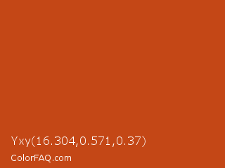 Yxy 16.304,0.571,0.37 Color is a normal orange color and the nearest color is Tia Maria #c1440e. Hex code #c44716 and RGB value is rgb(196,71,22). In RGB color space, this color is composed of 77% red, 28% green, 9% blue, In CMYK color space, this color is composed of 0% cyan, 64% magenta, 89% yellow , 23% black , In HSL color space, this color has a hue angle of 17° , 80% saturation and 43% lightness.