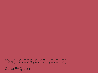 Yxy 16.329,0.471,0.312 Color is a normal red color and the nearest color is Bittersweet Shimmer #bf4f51. Hex code #ba4c59 and RGB value is rgb(186,76,89). In RGB color space, this color is composed of 73% red, 30% green, 35% blue, In CMYK color space, this color is composed of 0% cyan, 59% magenta, 52% yellow , 27% black , In HSL color space, this color has a hue angle of 353° , 44% saturation and 51% lightness.