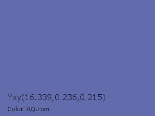 Yxy 16.339,0.236,0.215 Color is a normal blue color and the nearest color is Scampi #675fa6. Hex code #626cad and RGB value is rgb(98,108,173). In RGB color space, this color is composed of 38% red, 42% green, 68% blue, In CMYK color space, this color is composed of 43% cyan, 38% magenta, 0% yellow , 32% black , In HSL color space, this color has a hue angle of 232° , 31% saturation and 53% lightness.
