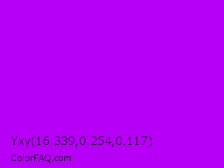 Yxy 16.339,0.254,0.117 Color is a normal purple color and the nearest color is Electric Purple #bf00ff. Hex code #b500f5 and RGB value is rgb(181,0,245). In RGB color space, this color is composed of 71% red, 0% green, 96% blue, In CMYK color space, this color is composed of 26% cyan, 100% magenta, 0% yellow , 4% black , In HSL color space, this color has a hue angle of 284° , 100% saturation and 48% lightness.