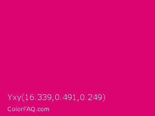Yxy 16.339,0.491,0.249 Color is a normal rose color and the nearest color is Red Purple #e40078. Hex code #db0471 and RGB value is rgb(219,4,113). In RGB color space, this color is composed of 86% red, 2% green, 44% blue, In CMYK color space, this color is composed of 0% cyan, 98% magenta, 48% yellow , 14% black , In HSL color space, this color has a hue angle of 330° , 96% saturation and 44% lightness.
