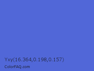 Yxy 16.364,0.198,0.157 Color is a normal blue color and the nearest color is Han Blue #446ccf. Hex code #5167d8 and RGB value is rgb(81,103,216). In RGB color space, this color is composed of 32% red, 40% green, 85% blue, In CMYK color space, this color is composed of 63% cyan, 52% magenta, 0% yellow , 15% black , In HSL color space, this color has a hue angle of 230° , 63% saturation and 58% lightness.