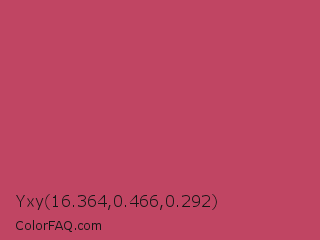 Yxy 16.364,0.466,0.292 Color is a normal red color and the nearest color is Popstar #be4f62. Hex code #c04563 and RGB value is rgb(192,69,99). In RGB color space, this color is composed of 75% red, 27% green, 39% blue, In CMYK color space, this color is composed of 0% cyan, 64% magenta, 48% yellow , 25% black , In HSL color space, this color has a hue angle of 345° , 49% saturation and 51% lightness.