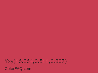Yxy 16.364,0.511,0.307 Color is a normal red color and the nearest color is Brick Red #cb4154. Hex code #c93d52 and RGB value is rgb(201,61,82). In RGB color space, this color is composed of 79% red, 24% green, 32% blue, In CMYK color space, this color is composed of 0% cyan, 70% magenta, 59% yellow , 21% black , In HSL color space, this color has a hue angle of 351° , 56% saturation and 51% lightness.