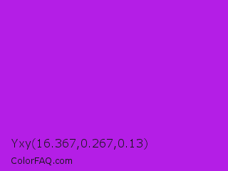 Yxy 16.367,0.267,0.13 Color is a normal purple color and the nearest color is Vivid Mulberry #b80ce3. Hex code #b41ee6 and RGB value is rgb(180,30,230). In RGB color space, this color is composed of 71% red, 12% green, 90% blue, In CMYK color space, this color is composed of 22% cyan, 87% magenta, 0% yellow , 10% black , In HSL color space, this color has a hue angle of 285° , 80% saturation and 51% lightness.