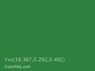 Yxy 16.367,0.292,0.492 Color is a normal green color and the nearest color is Goblin #3d7d52. Hex code #2e803e and RGB value is rgb(46,128,62). In RGB color space, this color is composed of 18% red, 50% green, 24% blue, In CMYK color space, this color is composed of 64% cyan, 0% magenta, 52% yellow , 50% black , In HSL color space, this color has a hue angle of 132° , 47% saturation and 34% lightness.