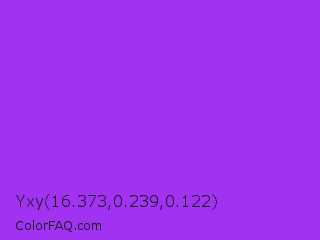 Yxy 16.373,0.239,0.122 Color is a normal purple color and the nearest color is Veronica #a020f0. Hex code #a232f2 and RGB value is rgb(162,50,242). In RGB color space, this color is composed of 64% red, 20% green, 95% blue, In CMYK color space, this color is composed of 33% cyan, 79% magenta, 0% yellow , 5% black , In HSL color space, this color has a hue angle of 275° , 88% saturation and 57% lightness.