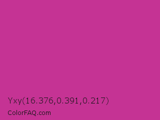 Yxy 16.376,0.391,0.217 Color is a normal magenta color and the nearest color is Royal Fuchsia #ca2c92. Hex code #c53394 and RGB value is rgb(197,51,148). In RGB color space, this color is composed of 77% red, 20% green, 58% blue, In CMYK color space, this color is composed of 0% cyan, 74% magenta, 25% yellow , 23% black , In HSL color space, this color has a hue angle of 320° , 59% saturation and 49% lightness.