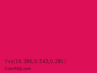 Yxy 16.386,0.543,0.281 Color is a normal rose color and the nearest color is Debian Red #d70a53. Hex code #dd0f56 and RGB value is rgb(221,15,86). In RGB color space, this color is composed of 87% red, 6% green, 34% blue, In CMYK color space, this color is composed of 0% cyan, 93% magenta, 61% yellow , 13% black , In HSL color space, this color has a hue angle of 339° , 87% saturation and 46% lightness.