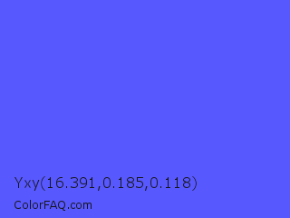 Yxy 16.391,0.185,0.118 Color is a light blue color and the nearest color is Very Light Blue #6666ff. Hex code #5858ff and RGB value is rgb(88,88,255). In RGB color space, this color is composed of 35% red, 35% green, 100% blue, In CMYK color space, this color is composed of 65% cyan, 65% magenta, 0% yellow , 0% black , In HSL color space, this color has a hue angle of 240° , 100% saturation and 67% lightness.