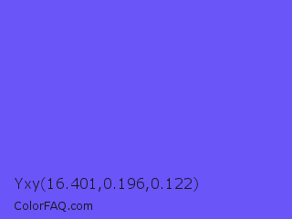 Yxy 16.401,0.196,0.122 Color is a light indigo color and the nearest color is Very Light Blue #6666ff. Hex code #6a55f9 and RGB value is rgb(106,85,249). In RGB color space, this color is composed of 42% red, 33% green, 98% blue, In CMYK color space, this color is composed of 57% cyan, 66% magenta, 0% yellow , 2% black , In HSL color space, this color has a hue angle of 248° , 93% saturation and 65% lightness.
