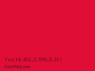 Yxy 16.401,0.596,0.31 Color is a normal red color and the nearest color is Crimson #dc143c. Hex code #e00d36 and RGB value is rgb(224,13,54). In RGB color space, this color is composed of 88% red, 5% green, 21% blue, In CMYK color space, this color is composed of 0% cyan, 94% magenta, 76% yellow , 12% black , In HSL color space, this color has a hue angle of 348° , 89% saturation and 46% lightness.