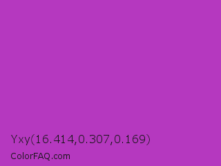 Yxy 16.414,0.307,0.169 Color is a normal magenta color and the nearest color is Steel Pink #cc33cc. Hex code #b538bf and RGB value is rgb(181,56,191). In RGB color space, this color is composed of 71% red, 22% green, 75% blue, In CMYK color space, this color is composed of 5% cyan, 71% magenta, 0% yellow , 25% black , In HSL color space, this color has a hue angle of 296° , 55% saturation and 48% lightness.