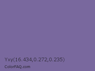 Yxy 16.434,0.272,0.235 Color is a normal indigo color and the nearest color is Kimberly #736c9f. Hex code #79689e and RGB value is rgb(121,104,158). In RGB color space, this color is composed of 47% red, 41% green, 62% blue, In CMYK color space, this color is composed of 23% cyan, 34% magenta, 0% yellow , 38% black , In HSL color space, this color has a hue angle of 259° , 22% saturation and 51% lightness.