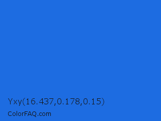Yxy 16.437,0.178,0.15 Color is a normal blue color and the nearest color is Bright Navy Blue #1974d2. Hex code #1d6ce1 and RGB value is rgb(29,108,225). In RGB color space, this color is composed of 11% red, 42% green, 88% blue, In CMYK color space, this color is composed of 87% cyan, 52% magenta, 0% yellow , 12% black , In HSL color space, this color has a hue angle of 216° , 77% saturation and 50% lightness.