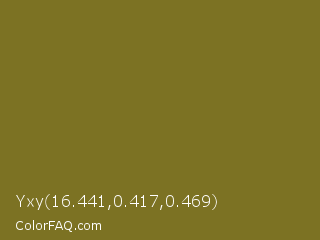 Yxy 16.441,0.417,0.469 Color is a normal yellow color and the nearest color is Crete #737829. Hex code #7c7223 and RGB value is rgb(124,114,35). In RGB color space, this color is composed of 49% red, 45% green, 14% blue, In CMYK color space, this color is composed of 0% cyan, 8% magenta, 72% yellow , 51% black , In HSL color space, this color has a hue angle of 53° , 56% saturation and 31% lightness.