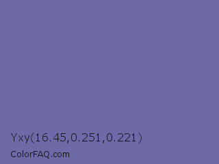 Yxy 16.45,0.251,0.221 Color is a normal indigo color and the nearest color is Deluge #7563a8. Hex code #6e6aa8 and RGB value is rgb(110,106,168). In RGB color space, this color is composed of 43% red, 42% green, 66% blue, In CMYK color space, this color is composed of 35% cyan, 37% magenta, 0% yellow , 34% black , In HSL color space, this color has a hue angle of 244° , 26% saturation and 54% lightness.