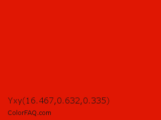 Yxy 16.467,0.632,0.335 Color is a normal red color and the nearest color is Rosso Corsa #d40000. Hex code #e01703 and RGB value is rgb(224,23,3). In RGB color space, this color is composed of 88% red, 9% green, 1% blue, In CMYK color space, this color is composed of 0% cyan, 90% magenta, 99% yellow , 12% black , In HSL color space, this color has a hue angle of 5° , 97% saturation and 45% lightness.