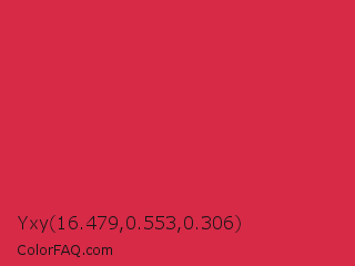 Yxy 16.479,0.553,0.306 Color is a normal red color and the nearest color is Rusty Red #da2c43. Hex code #d62a47 and RGB value is rgb(214,42,71). In RGB color space, this color is composed of 84% red, 16% green, 28% blue, In CMYK color space, this color is composed of 0% cyan, 80% magenta, 67% yellow , 16% black , In HSL color space, this color has a hue angle of 350° , 68% saturation and 50% lightness.